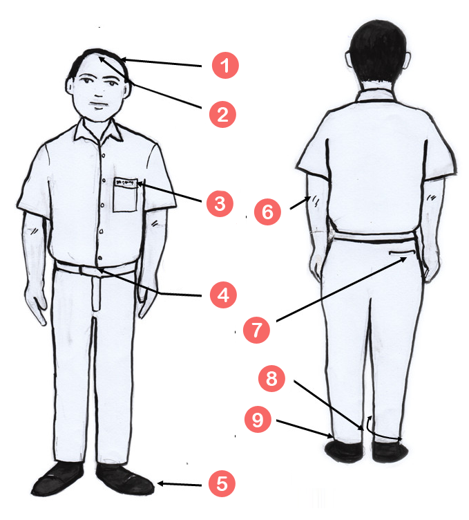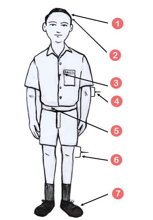 - Hair should be cut short and combed to the side. (Side part hair length 1/2 inch)
